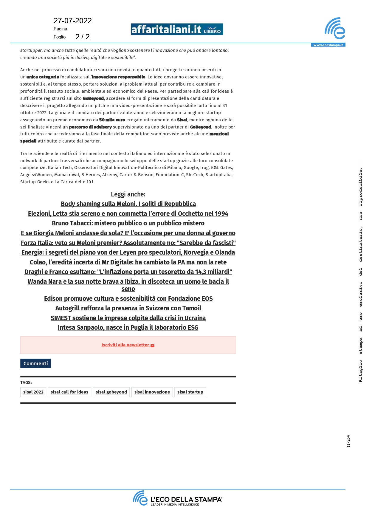Press, HIGHLIGHT, Rassegna stampa, News, Social responsibility Affariitaliani.it – Innovazione: al via ‘GoBeyond’, startup competition di Sisal Pubblicato il Luglio 27, 2022Luglio 28, 2022 da useradmin 27 Lug useradmin “IN 3 MINUTI”, 5° puntata – “Cambiamento e competenze? Le soft skills” (2° parte) llSole24Ore.com – Gobeyond 2022: al via la sesta edizione della startup competition di Sisal per supportare l’innovazione