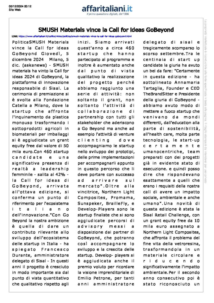 Press, HIGHLIGHT, Rassegna stampa, News Affaritaliani.it – SMUSH Materials vince la Call for ideas GoBeyond Pubblicato il Dicembre 5, 2024Dicembre 11, 2024 da useradmin 05 Dic useradmin L’evoluzione della figura dell’HR: dal ruolo amministrativo alla centralità strategica ilgiornale.it – “GoBeyond”: Sisal supporta le startup di innovazione responsabile