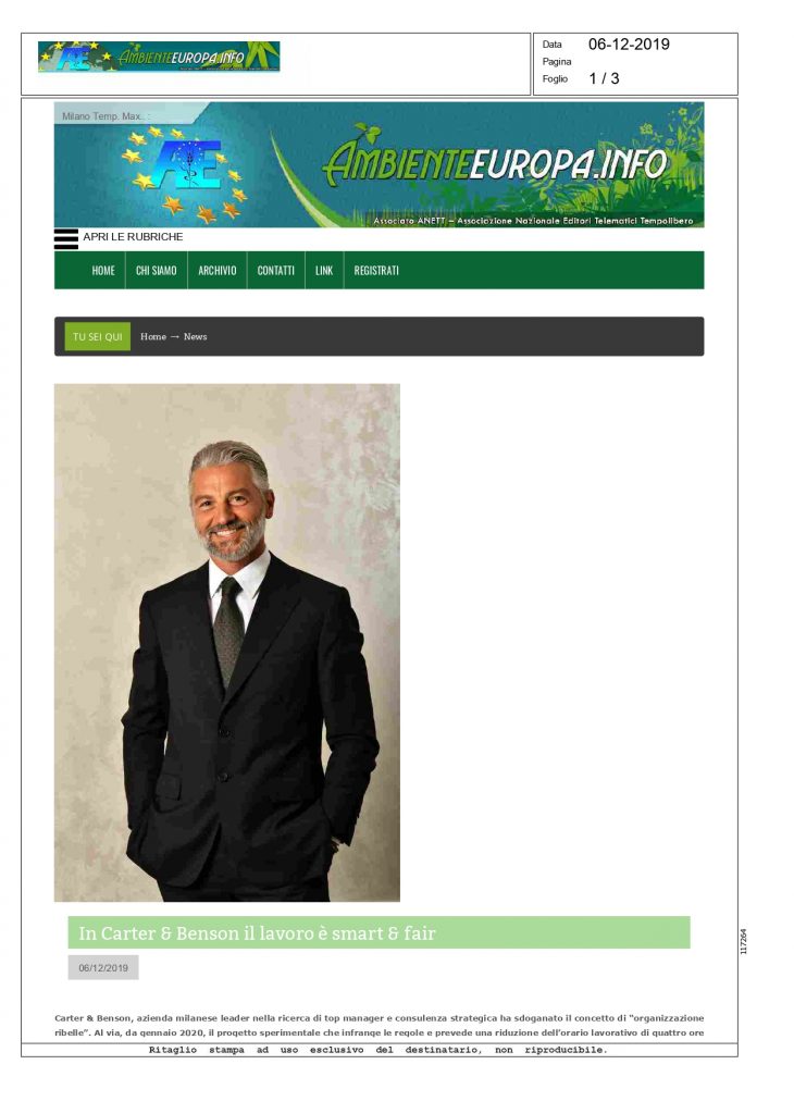 Rassegna stampa, Social responsibility AMBIENTEEUROPA.INFO – In Carter & Benson il lavoro è smart & fair Pubblicato il Dicembre 24, 2019Agosto 10, 2020 da useradmin 24 Dic per leggere l’articolo clicca qui https://www.ambienteeuropa.info/news_dettaglio.php?id=5183 useradmin REPUBBLICA.IT – Parte la settimana cortissima alla Carter & Benson: quattro giorni di lavoro, stesso stipendio INFORMAZIONE24.ALTERVISTA.ORG – Parte la settimana cortissima alla Carter&Benson: quattro giorni di lavoro, stesso stipendio