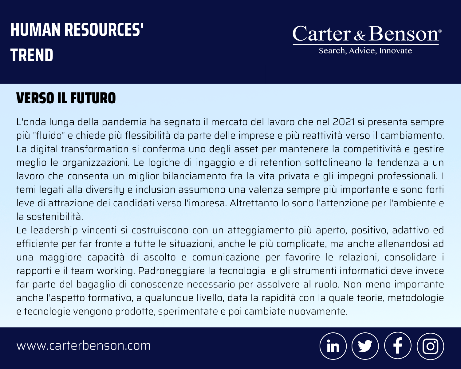 Il periodo è stato caratterizzato anche da un’attenzione sempre maggiore verso temi di work-life balance, diversity & inclusion, approccio sostenibile, leadership aperte e positive improntate sull’ascolto e la comunicazione, team working.