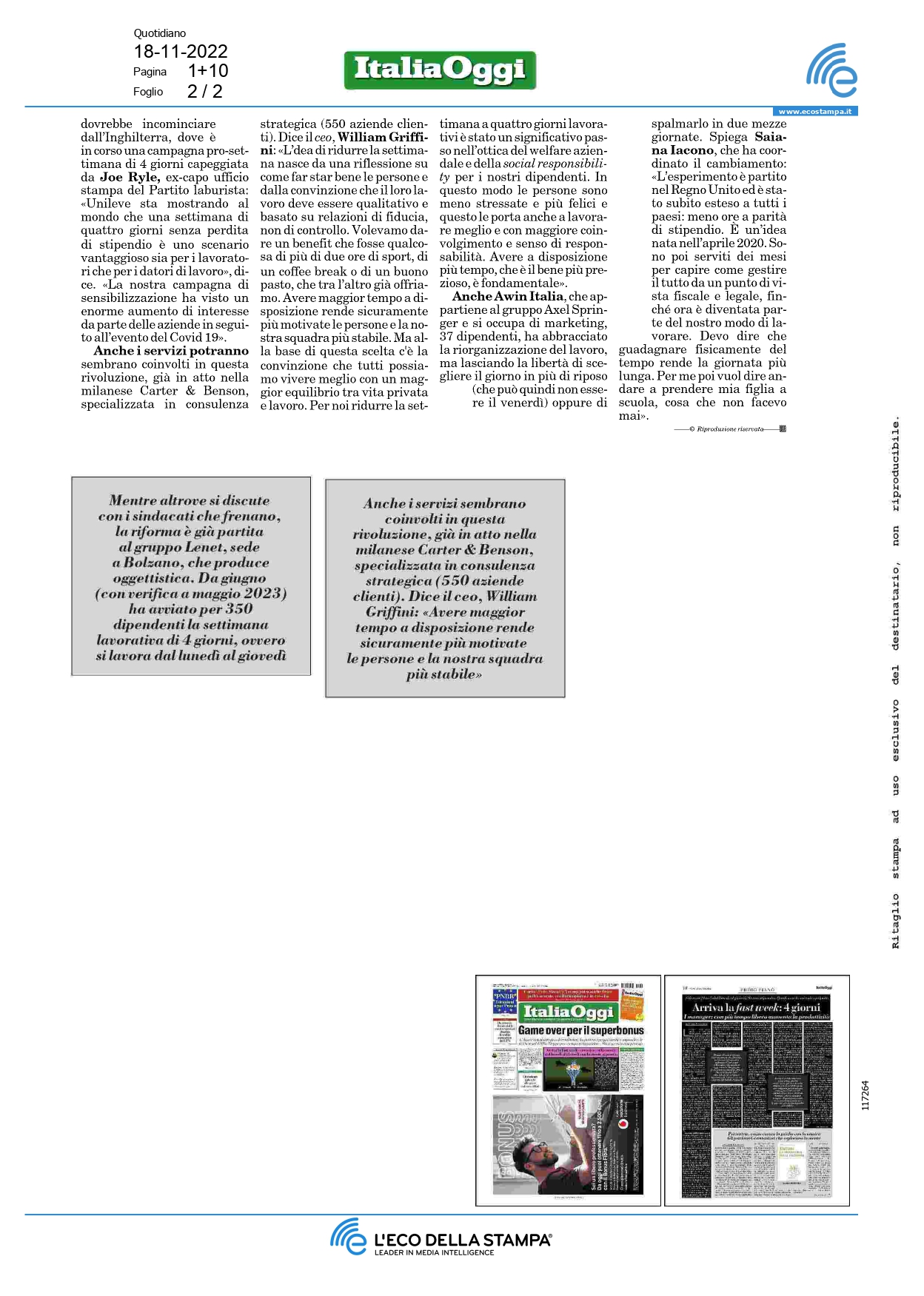 Uncategorized, HIGHLIGHT, Press review, Social responsibility, News ItaliaOggi – Arriva la fast week: 4 giorni Posted on November 18, 2022 by useradmin 18 Nov useradmin Leasing Magazine – Smart working: facciamo il punto “Business wasn’t built in a day”, 4° puntata giovedì 24 novembre