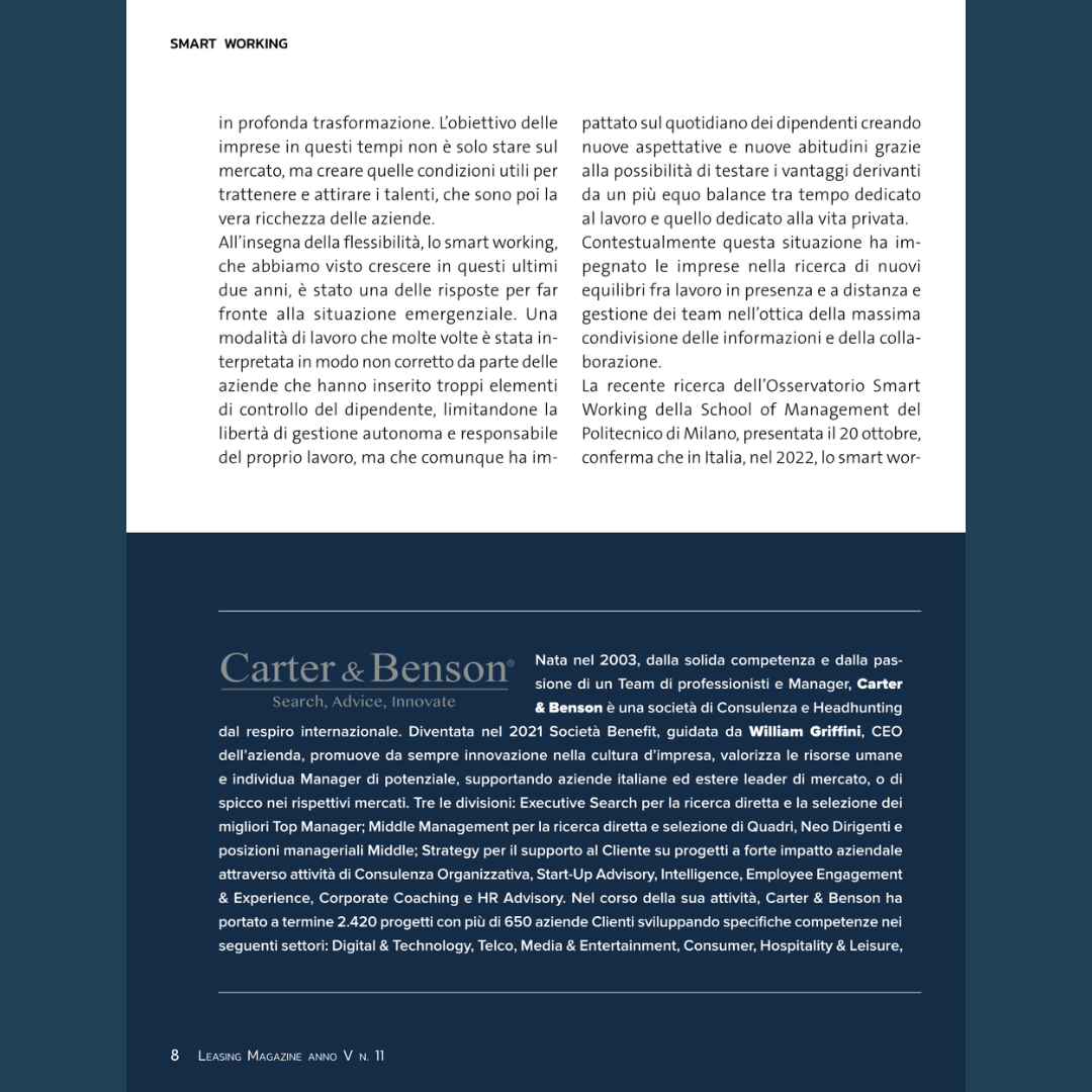 Uncategorized, HIGHLIGHT, Press review, Social responsibility, News Leasing Magazine – Smart working: facciamo il punto Posted on November 16, 2022November 16, 2022 by useradmin 16 Nov Potrebbe interessarti anche: Smart working, nuovi modelli organizzativi Cambio di mindset o change management? useradmin Human Capital Lab, il podcast di Carter & Benson ItaliaOggi – Arriva la fast week: 4 giorni