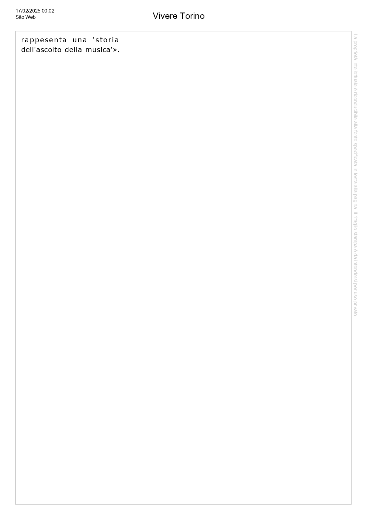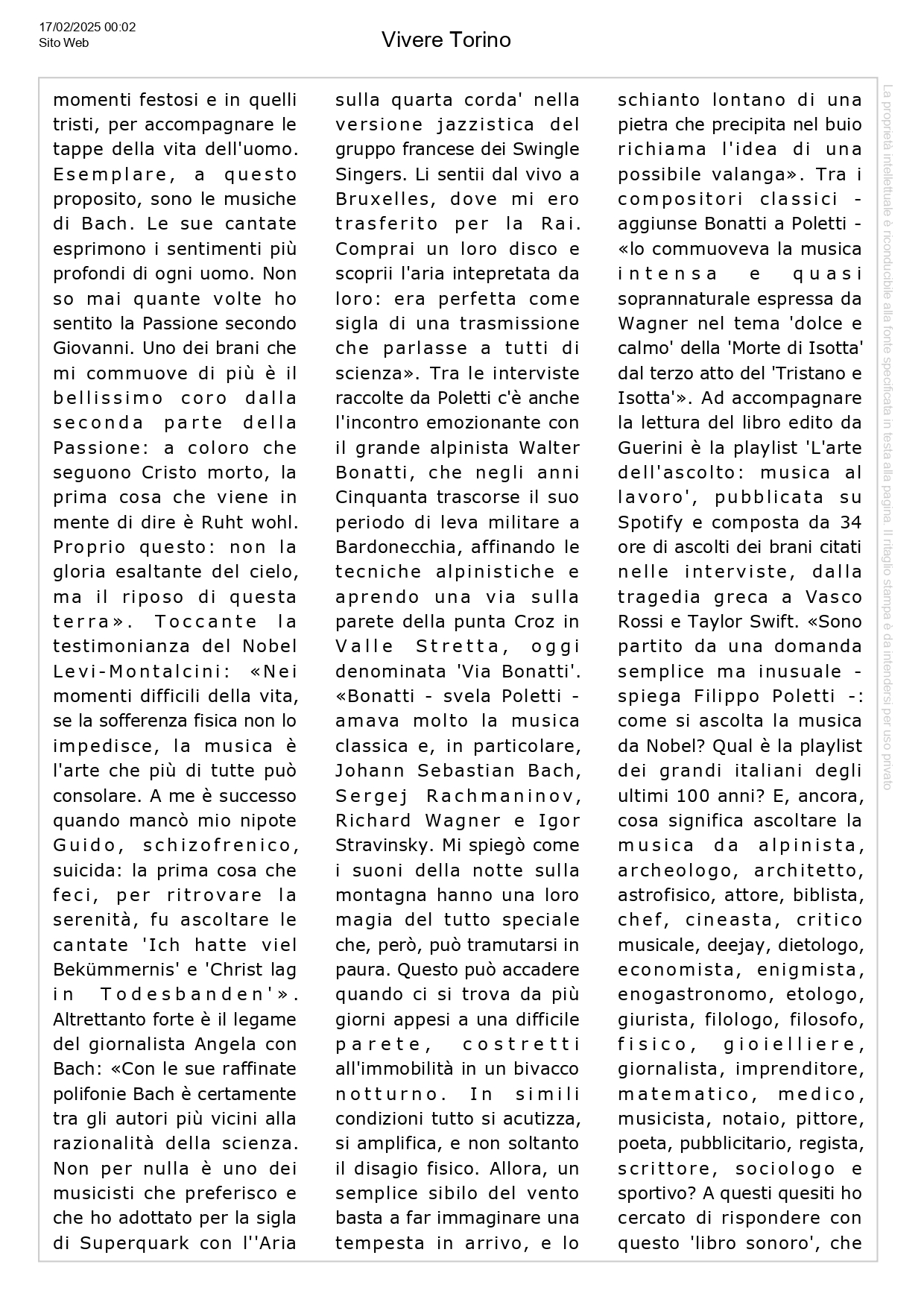 Uncategorized, HIGHLIGHT, Press review, Social responsibility, News Liquidarte.it – Filippo Poletti – L’arte dell’ascolto: musica al lavoro – 120 interviste a grandi personaggi con playlist di 34 ore su Spotify Posted on February 19, 2025 by useradmin 19 Feb useradmin Vivere Torino – Bobbio, Montalcini e Angela uniti dalla passione per Bach: nel libro “L’arte dell’ascolto” di Filippo Poletti le interviste fino a oggi inedite Aostasports.it – La Thuile: il 22 marzo torna la gara di sci di beneficienza per Il Bivacco Camardella