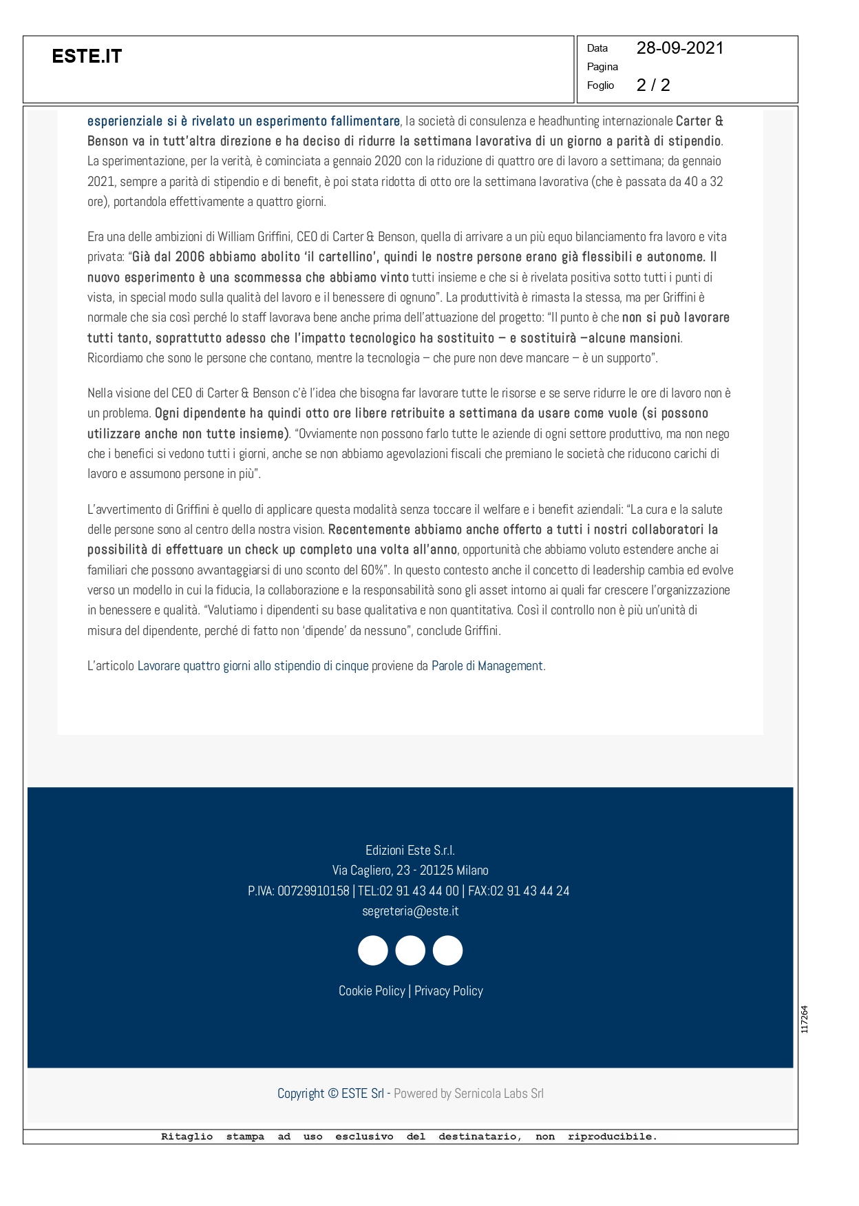 Press, HIGHLIGHT, Rassegna stampa, News, Social responsibility este.it – Lavorare quattro giorni allo stipendio di cinque Pubblicato il Settembre 30, 2021 da useradmin 30 Set Leggi l’articolo sul sito useradmin Paroledimanagement.it – Lavorare quattro giorni allo stipendio di cinque venetoeconomia.it – Smart working e formazione nel post-Covid, torna «Maps for Future», il festival di Niuko