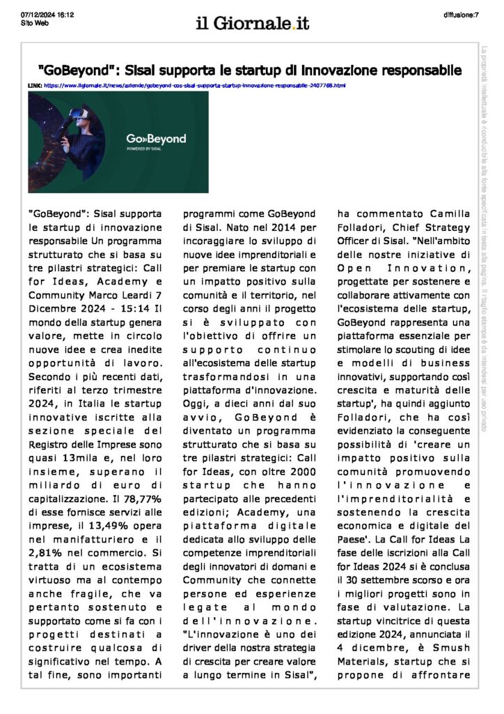 Press, HIGHLIGHT, Rassegna stampa, News, Social responsibility ilgiornale.it – “GoBeyond”: Sisal supporta le startup di innovazione responsabile Pubblicato il Dicembre 7, 2024Dicembre 11, 2024 da useradmin 07 Dic useradmin Affaritaliani.it – SMUSH Materials vince la Call for ideas GoBeyond IN 3 MINUTI, 26° puntata – “Strumenti di assessment, il valore e l’utilizzo nell’employee journey – IN 3 MINUTI”