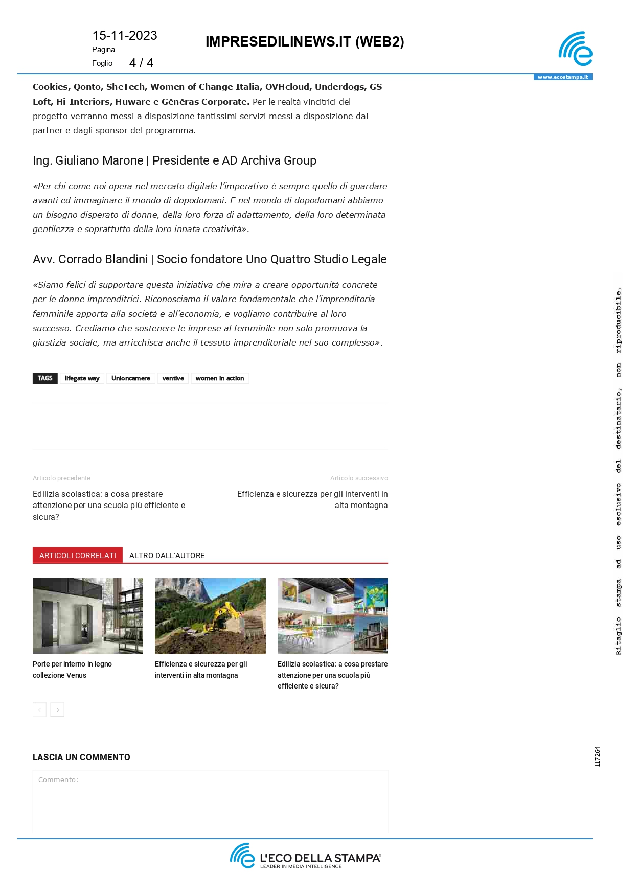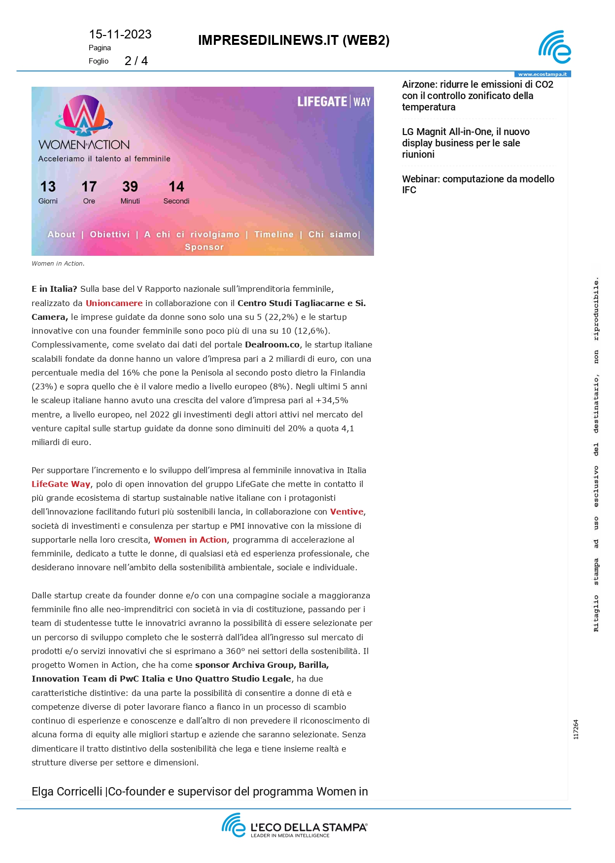 Press, HIGHLIGHT, Rassegna stampa, News, Social responsibility IMPRESEDILINEWS.IT – L’imprenditoria femminile fa fatica ad emergere e affermarsi in Europa Pubblicato il Novembre 15, 2023Novembre 27, 2023 da useradmin 15 Nov useradmin AUTOMAZIONE-PLUS.IT – LifeGate Way lancia il programma d’accelerazione Women in Action IN 3 MINUTI, 15° puntata – “Startup femminili, dati e possibilità di fare impresa”