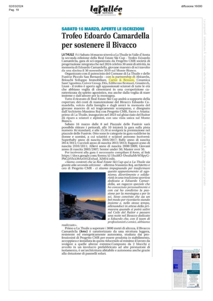 Press, HIGHLIGHT, Rassegna stampa, News, Social responsibility, Charity La Vallée Notizie – Trofeo Edoardo Camardella per sostenere il Bivacco Pubblicato il Marzo 2, 2024Marzo 7, 2024 da useradmin 02 Mar useradmin Business wasn’t built in a day – Intervista a Giovanna Mazzocchi, Presidente di Editoriale Domus requadro.com – Appuntamento a La Thuile con la 2° Real estate ski cup organizzata da Progetto Cmr