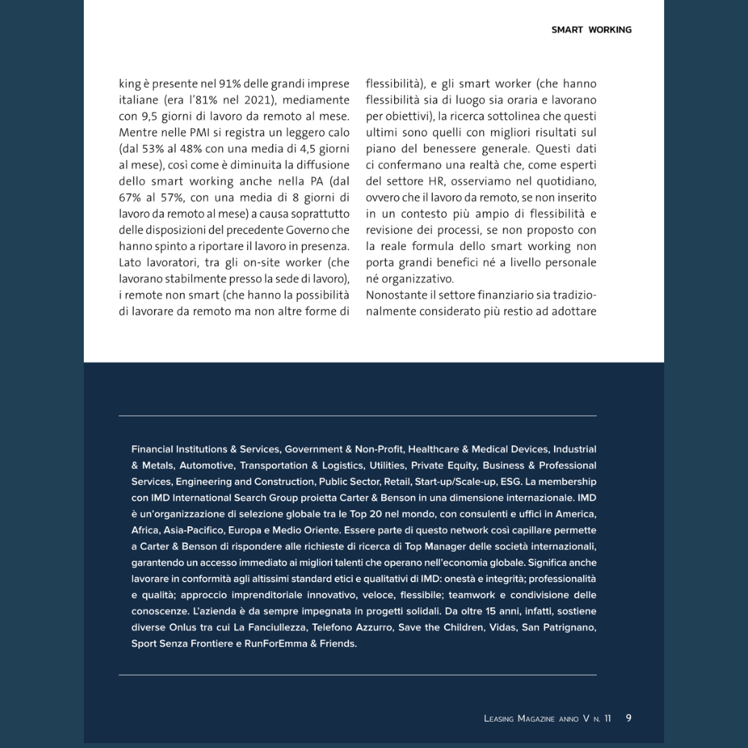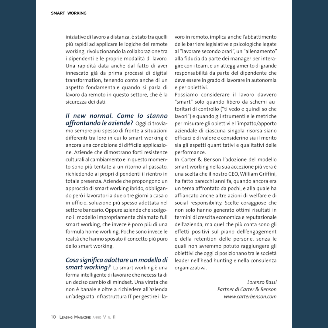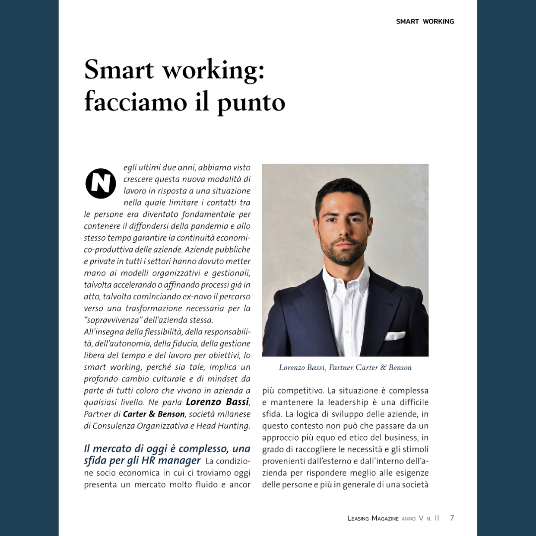Press, HIGHLIGHT, Rassegna stampa, News, Social responsibility Leasing Magazine – Smart working: facciamo il punto Pubblicato il Novembre 16, 2022 da useradmin 16 Nov Potrebbe interessarti anche: Smart working, nuovi modelli organizzativi Cambio di mindset o change management? useradmin Human Capital Lab, il podcast di Carter & Benson – “Mondo HR: i trend del 2023!” – S.1 EP. 4 Human Capital Lab, il podcast di Carter & Benson – “ESG, non c’è più tempo!” – S.1 EP.2