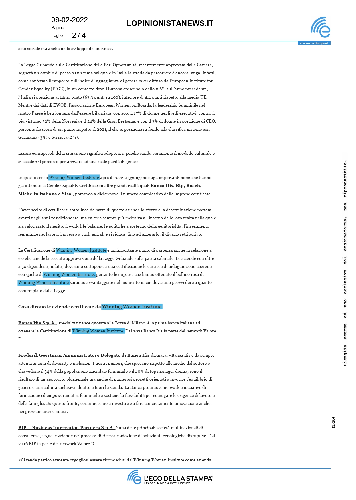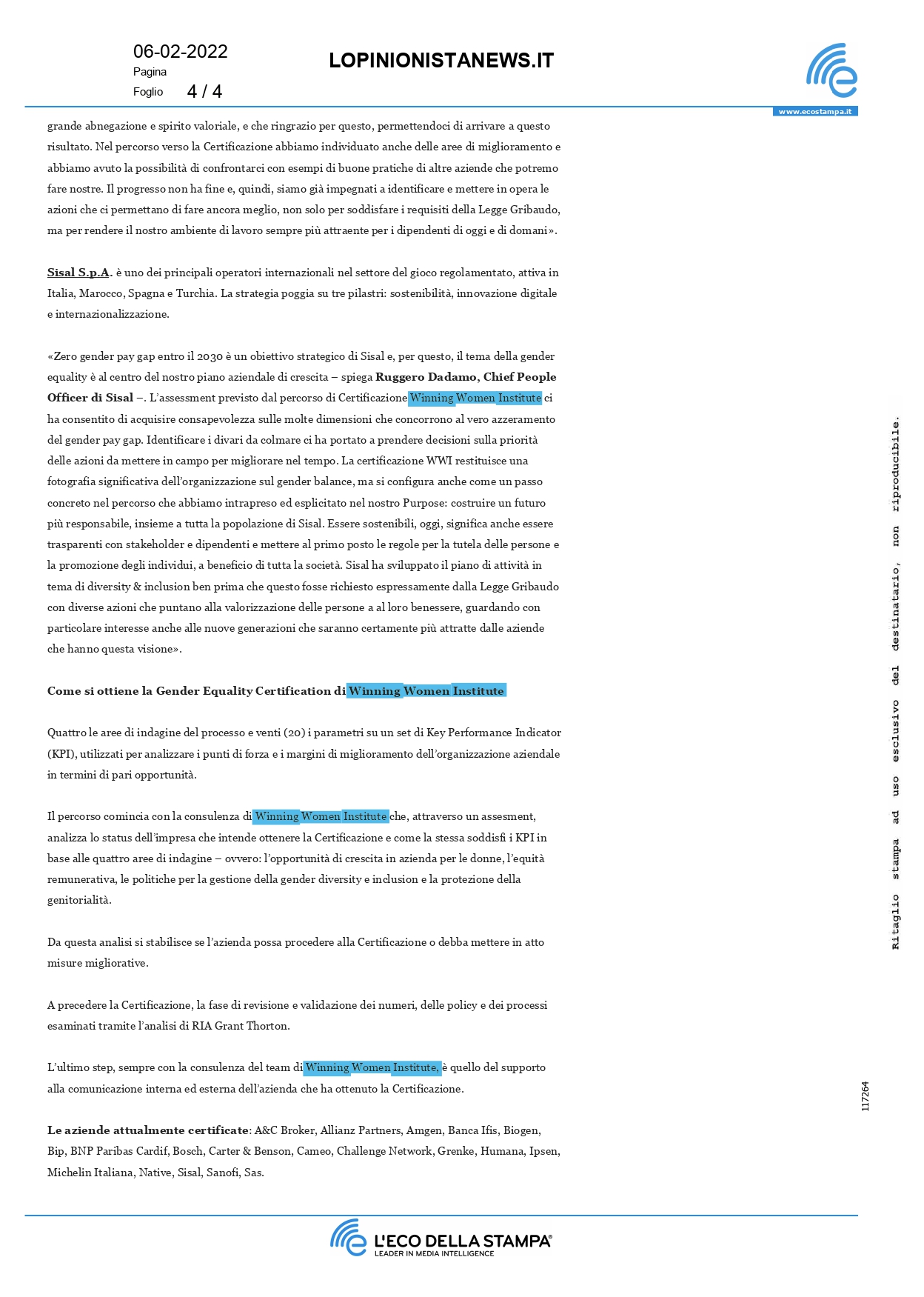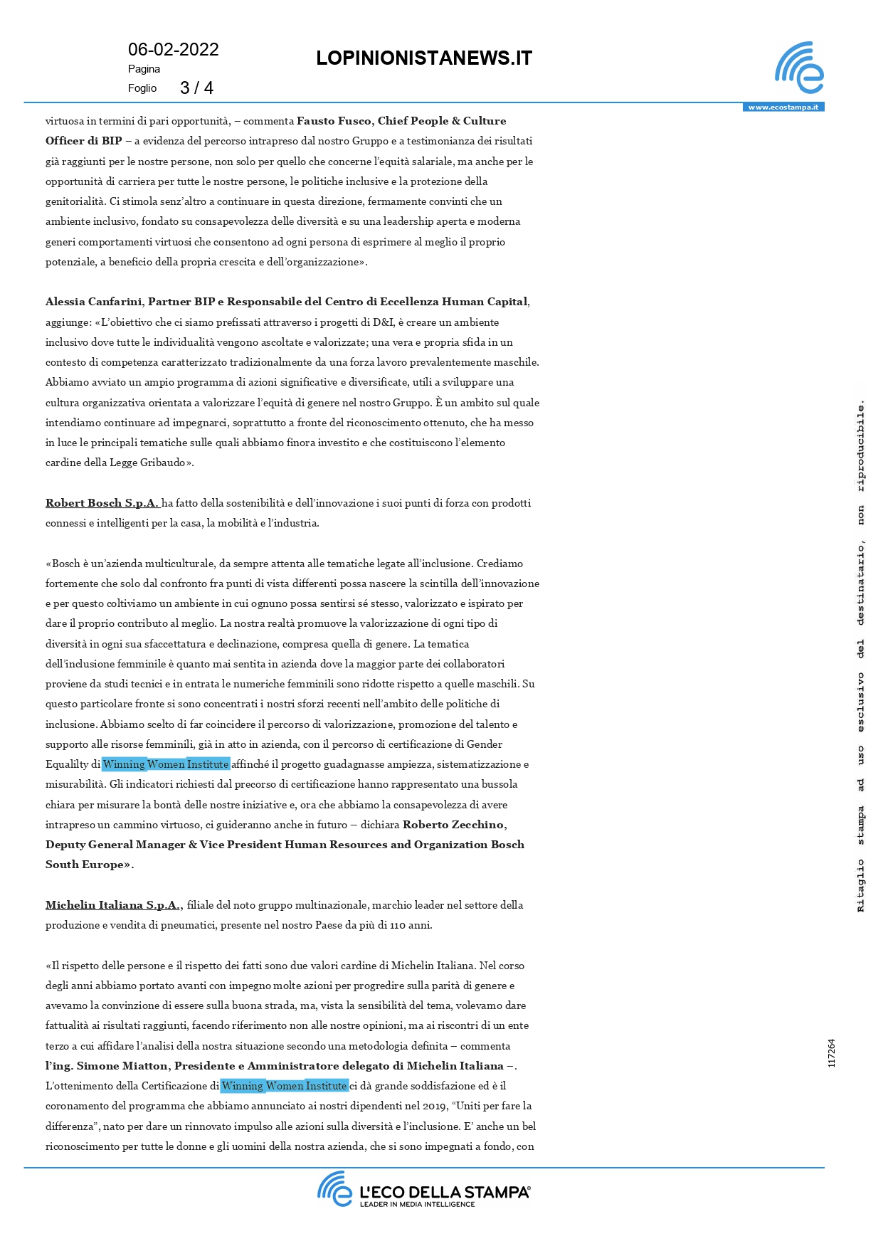 Press, HIGHLIGHT, Rassegna stampa, News, Social responsibility L’opinionistanews.it – Banca Ifis, Bip, Bosch, Michelin, Sisal ottengono la certificazione di Winning Women Institute Pubblicato il Febbraio 6, 2022Febbraio 21, 2022 da useradmin 06 Feb useradmin Reputation asset strategico per l’impresa Dealogando.com – Lavoro Mentre il resto del mondo si muove verso la settimana lavorativa corta, cosa sta facendo l’Italia per aiutare gli impiegati?