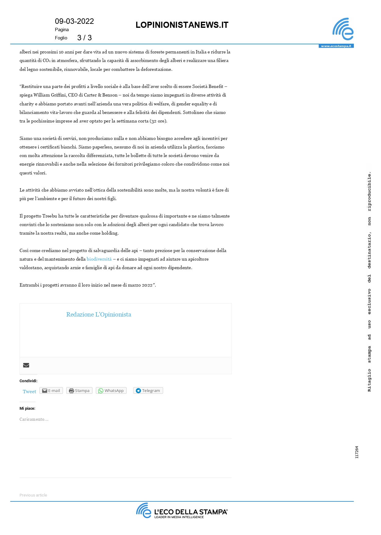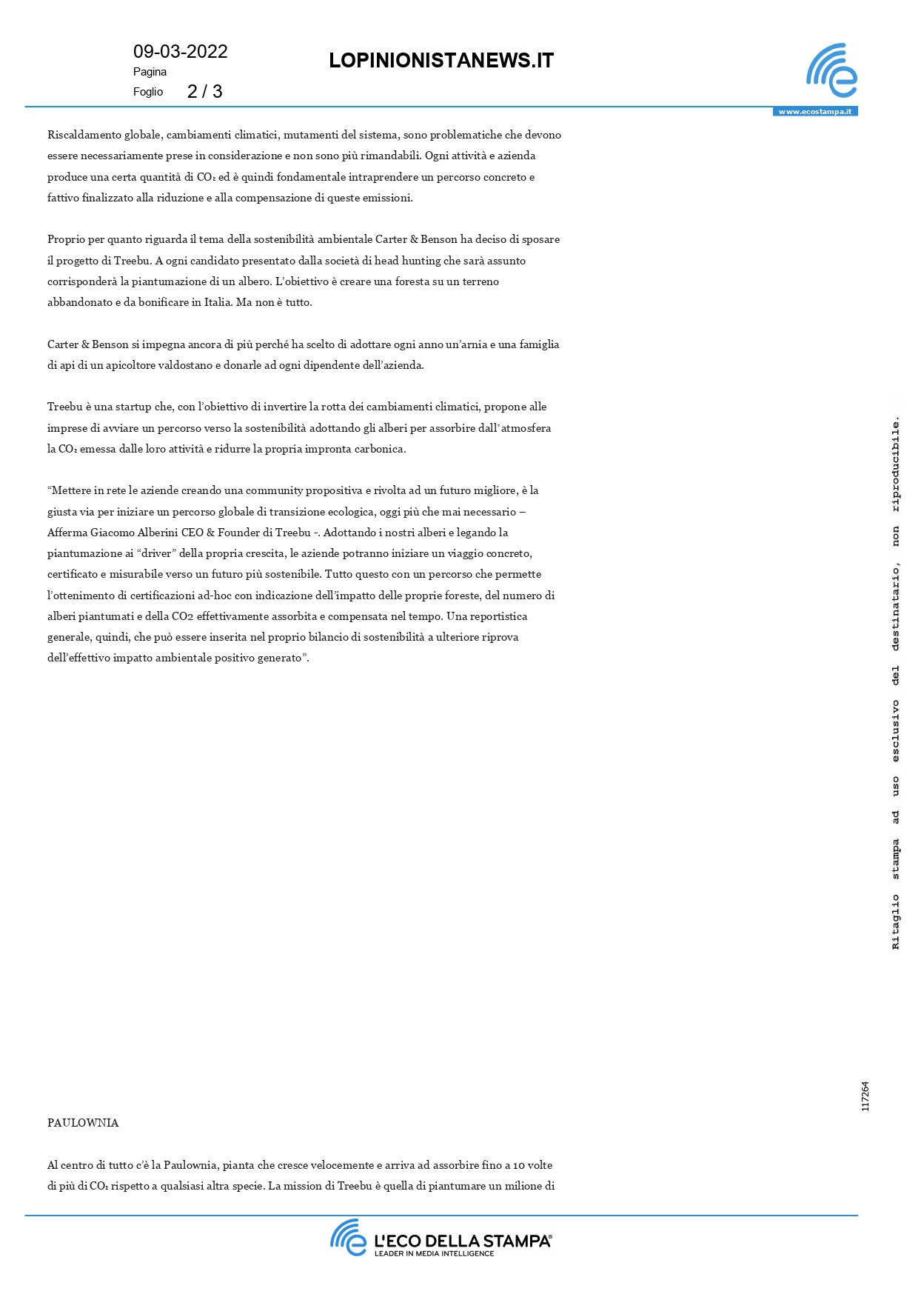 Press, HIGHLIGHT, Rassegna stampa, News, Social responsibility lopinionistanews.it – Carter & Benson pianta un albero per ogni assunto Pubblicato il Marzo 9, 2022 da useradmin 09 Mar useradmin PRESS RELEASE – Sostenibilità, il futuro parte dalla natura dailygreen.it – Sostenibilità, il futuro parte dalla natura