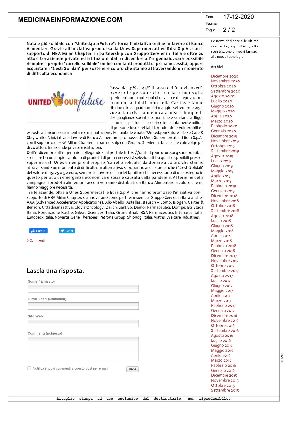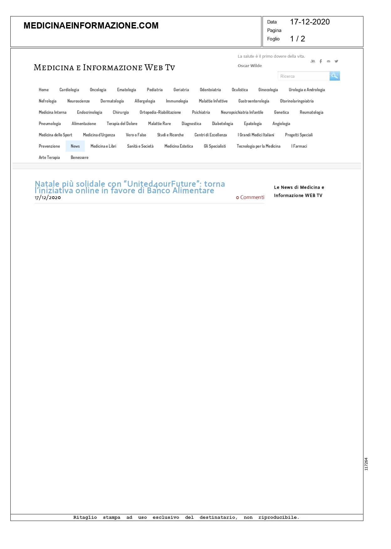 Press, HIGHLIGHT, Rassegna stampa, Social responsibility, Charity medicinaeinformazione.com – Natale più solidale con “United4ourFuture”: torna l’iniziativa online in favore di Banco Alimentare Pubblicato il Dicembre 18, 2020Dicembre 18, 2020 da useradmin 18 Dic useradmin greenretail.news – Natale più solidale con United4ourFuture: torna l’iniziativa on-line in favore di Banco Alimentare Ad una settimana dal lancio, è stata raccolta una spesa del valore di 5.023,37 euro per le famiglie più fragili