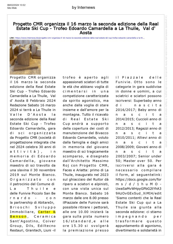 Press, HIGHLIGHT, Rassegna stampa, News, Social responsibility, Charity Progetto CMR organizza il 16 marzo la seconda edizione della Real Estate Ski Cup – Trofeo Edoardo Camardella a La Thuile, Val d’ Aosta Pubblicato il Febbraio 8, 2024Febbraio 12, 2024 da useradmin 08 Feb useradmin comunicati-stampa.net, Winning Women Institute Awards, seconda edizione: 13 le nuove aziende premiate per aver ottenuto la certificazione di parità di genere Comunicati-stampa.net, La Thuile 16.03.2024: al via la gara di sci per sostenere il Bivacco Camardella