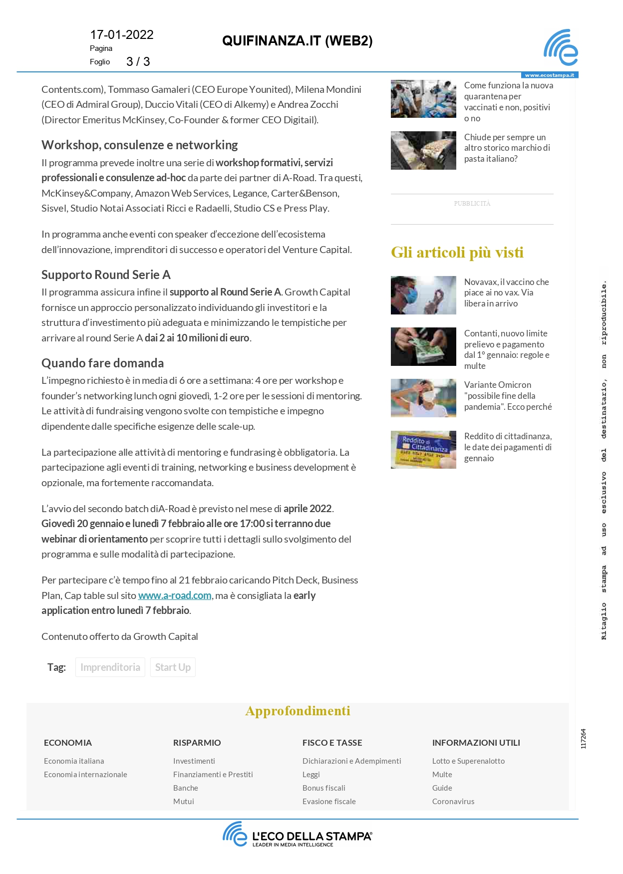 Press, HIGHLIGHT, Rassegna stampa, News Quifinanza.it – Growth Capital lancia il secondo batch di A-Road, il programma di accelerazione per le migliori scale-up Pubblicato il Gennaio 17, 2022 da useradmin 17 Gen useradmin BitMat.it – A-Road: al via il secondo batch. Candidature aperte fino al 21 febbraio Agenfood.it – Banco Alimentare, risultati finali: “Un sorRISO con il cuore e la MENTE