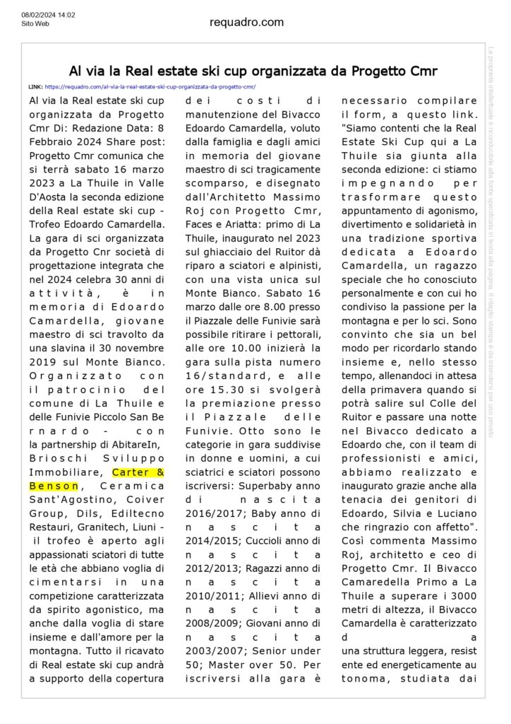 Press, HIGHLIGHT, Rassegna stampa, News, Social responsibility, Charity requadro.com – Al via la Real estate ski cup organizzata da Progetto Cmr Pubblicato il Febbraio 8, 2024Febbraio 12, 2024 da useradmin 08 Feb useradmin IN 3 MINUTI, 17° puntata – “Trend 2024, tra flessibilità e work-life balance” comunicati-stampa.net, Winning Women Institute Awards, seconda edizione: 13 le nuove aziende premiate per aver ottenuto la certificazione di parità di genere