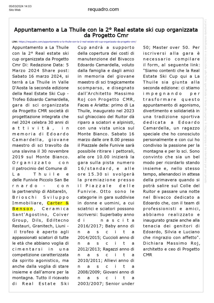 Press, HIGHLIGHT, Rassegna stampa, News, Social responsibility, Charity requadro.com – Appuntamento a La Thuile con la 2° Real estate ski cup organizzata da Progetto Cmr Pubblicato il Marzo 6, 2024Marzo 7, 2024 da useradmin 06 Mar useradmin La Vallée Notizie – Trofeo Edoardo Camardella per sostenere il Bivacco IN 3 MINUTI, 18° puntata – “Benessere lavorativo: l’analisi dei dati di uno studio sui trend HR”