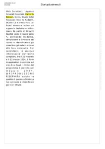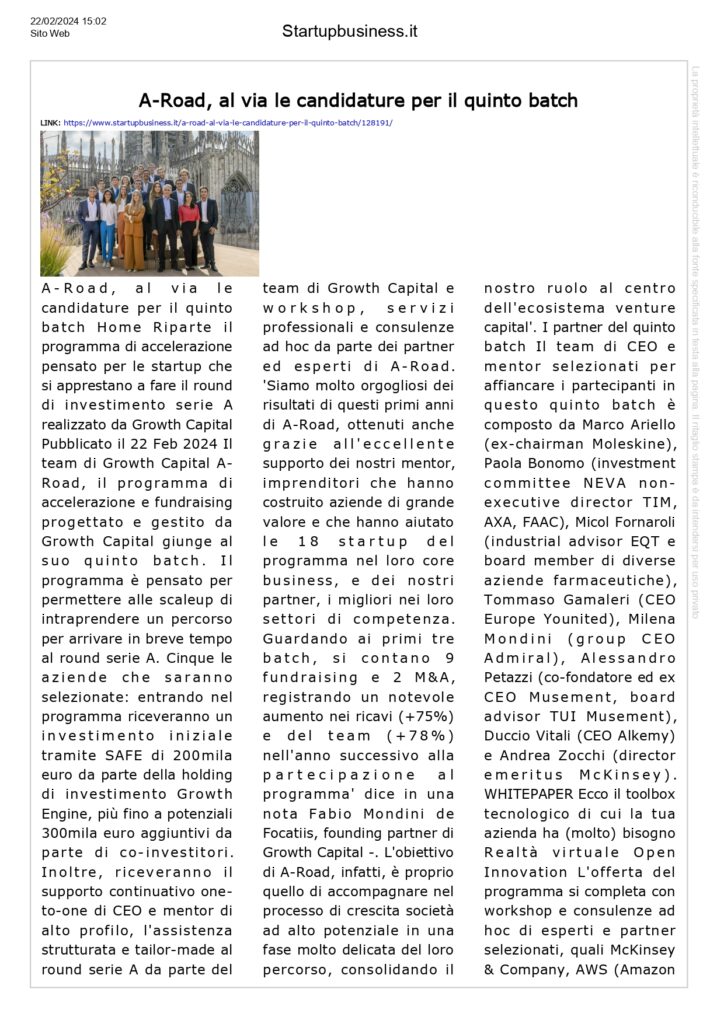 Press, HIGHLIGHT, Rassegna stampa, News Startupbusiness.it – A-Road, al via le candidature per il quinto batch Pubblicato il Febbraio 22, 2024Febbraio 26, 2024 da useradmin 22 Feb useradmin Human Capital Lab, il podcast di Carter & Benson – “Trend 2024, tra flessibilità e work-life balance” – S.1 EP.13 Askanews – Batch #5 di A-Road: al via il programma di accelerazione e fundraising di Growth Capital