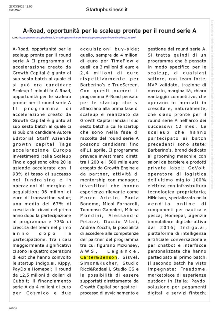 Press, HIGHLIGHT, Rassegna stampa, News, Social responsibility Startupbusiness.it – A-Road, opportunità per le scaleup pronte per il round serie A Pubblicato il Marzo 31, 2025 da useradmin 31 Mar useradmin IN 3 MINUTI “Employee Experience dalla selezione al lavoro: come renderla migliore” A cinque anni dal Covid: come è cambiato il mondo del lavoro?