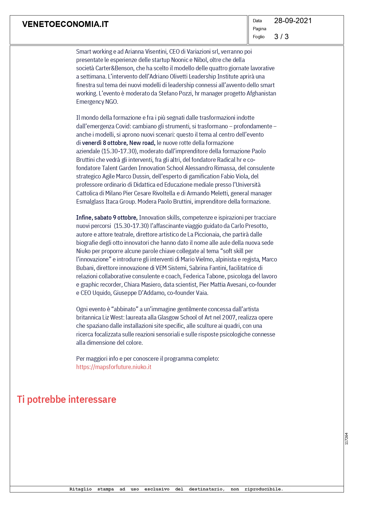 Press, HIGHLIGHT, Rassegna stampa, News, Social responsibility venetoeconomia.it – Smart working e formazione nel post-Covid, torna «Maps for Future», il festival di Niuko Pubblicato il Settembre 30, 2021 da useradmin 30 Set useradmin este.it – Lavorare quattro giorni allo stipendio di cinque startupbusiness.it – A-Road, da Growth Capital l’acceleratore per scaleup