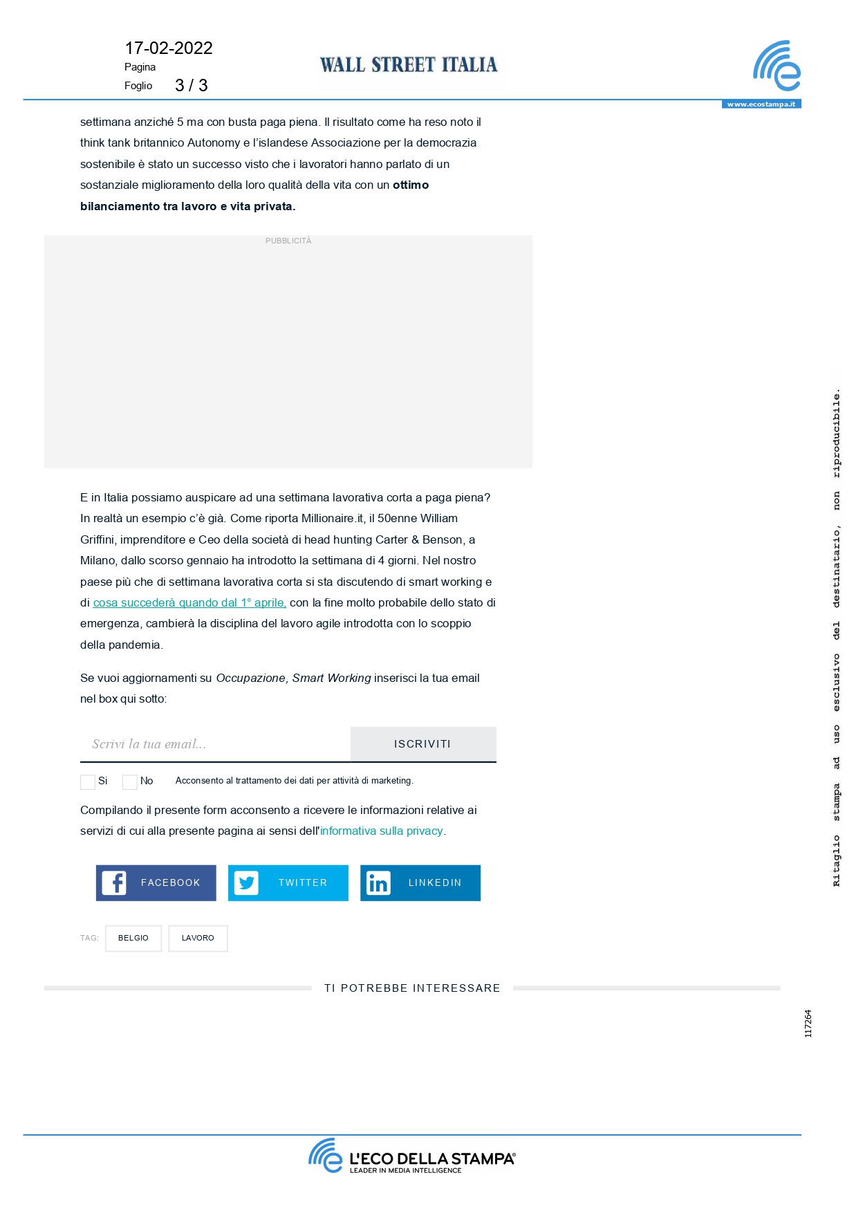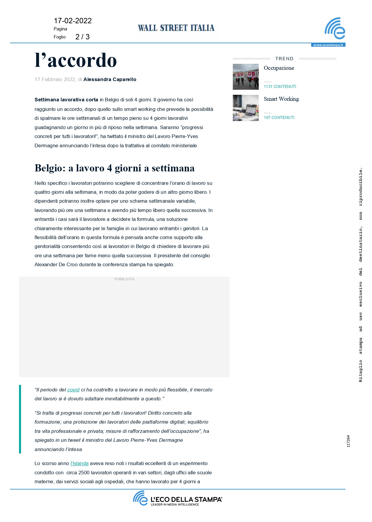 Press, HIGHLIGHT, Rassegna stampa, News, Social responsibility Wallstreetitalia.com – In Belgio a lavoro solo 4 giorni a settimana: arriva l’accordo Pubblicato il Febbraio 17, 2022Febbraio 21, 2022 da useradmin 17 Feb useradmin Dealogando.com – Lavoro Mentre il resto del mondo si muove verso la settimana lavorativa corta, cosa sta facendo l’Italia per aiutare gli impiegati? Wallstreetitalia.com – Belgio introduce settimana lavorativa corta ma sempre a 38 ore